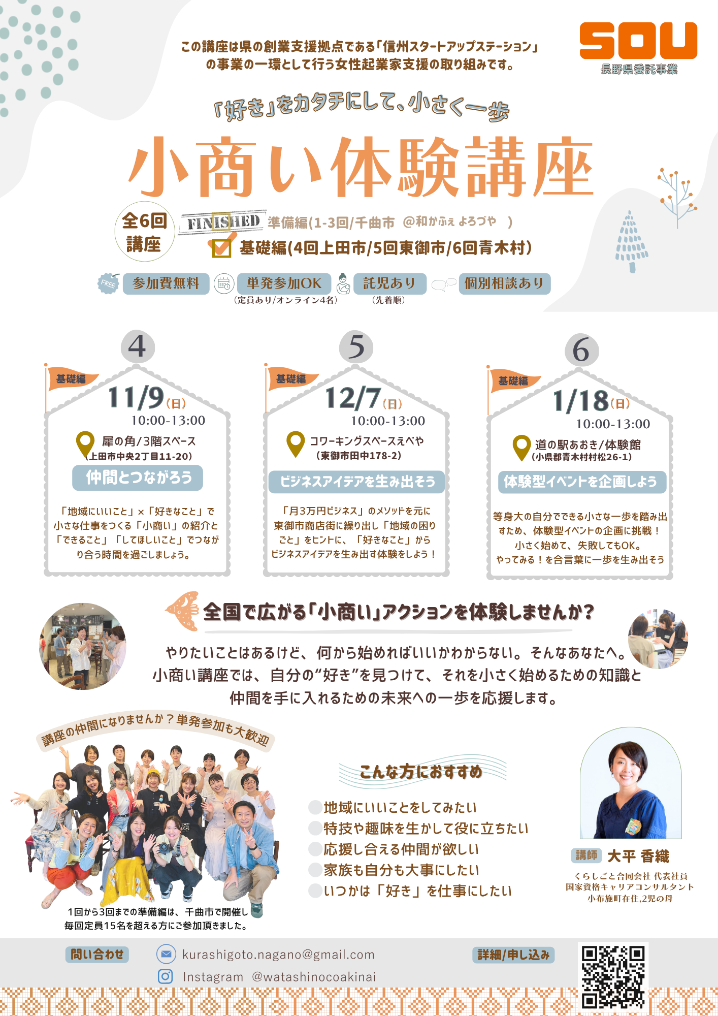 小商い講座では、自分の“好き”を見つけて、それを小さく始めるための知識と仲間を手に入れるための未来への一歩を応援します。開催毎にsouの個別相談も受け付けます!