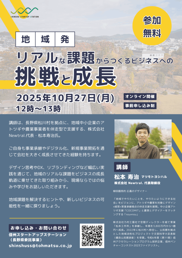 講師は、長野県松川村を拠点に、地域中小企業のアトツギや農業事業者を伴走型で支援する、株式会社Newtral.代表・松本寿治氏。