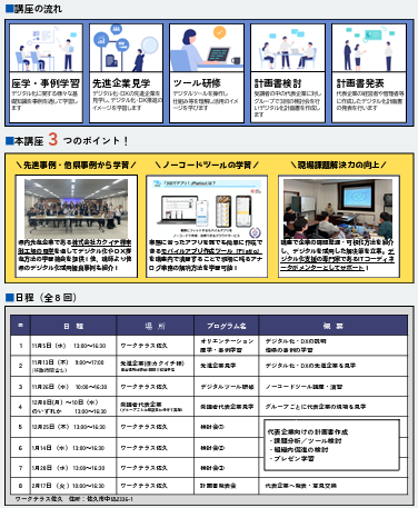 本講座は、県内企業の現場課題を自ら整理・分析し、デジタルの力を活用して解決へ導く人材を育成することを目的としています。全8回の講座(座学・先進企業(株式会社カクイチ様)見学・ツール操作・グループワーク等)を通じて、課題の可視化から改善策の立案を行うことで、企業のみならず、支援機関やIT事業者の実践的な課題解決力を高めます。。