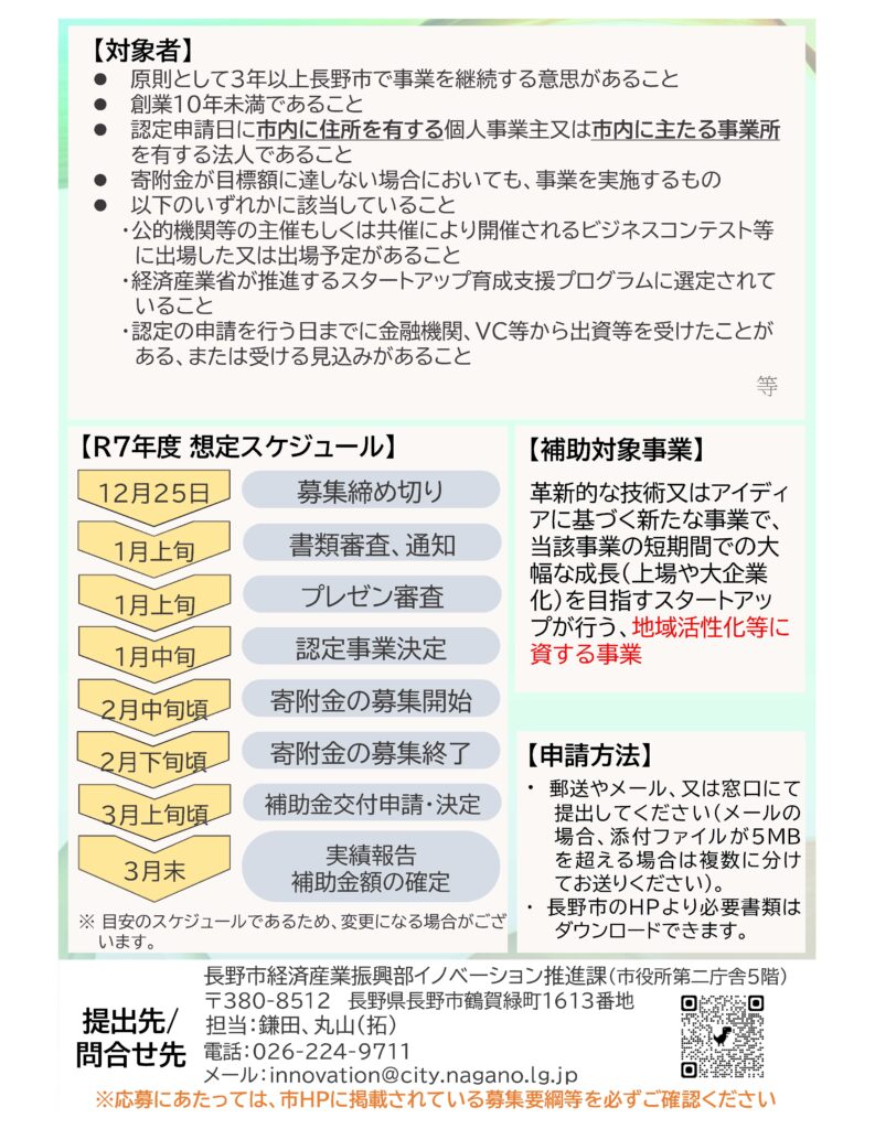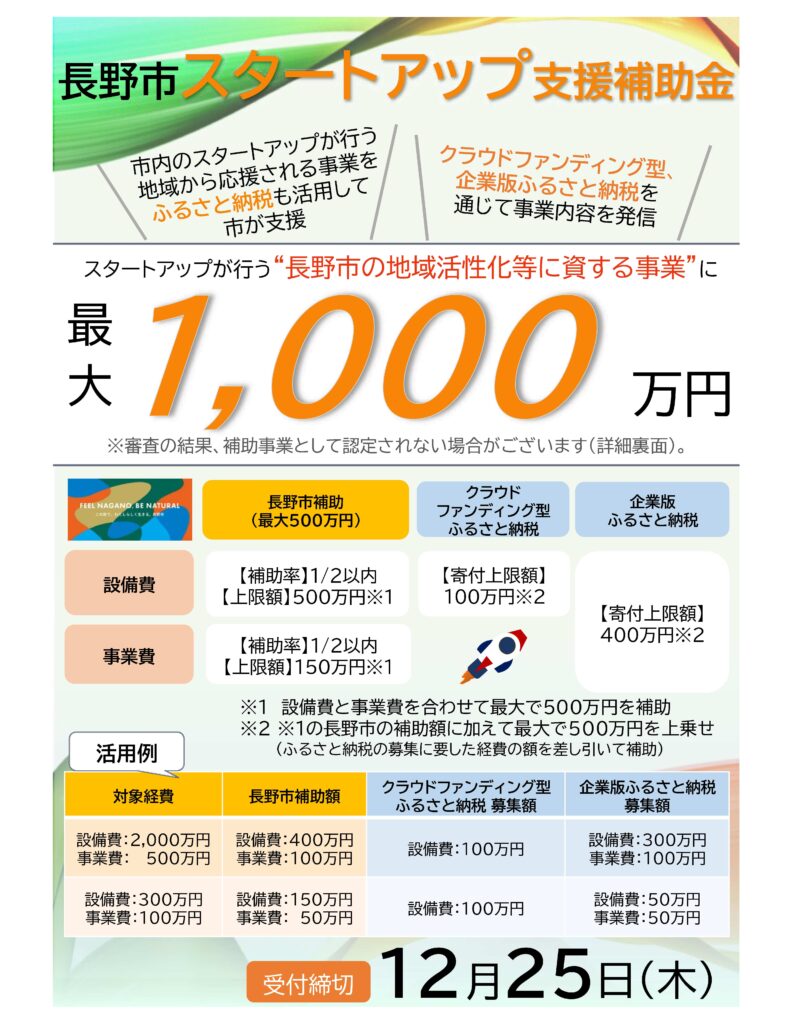 長野市にスタートアップを集積することにより、新事業の創出及び地域活性化を図るため、市内において起業し、又は起業したスタートアップ※が行う地域活性化等に資する事業に要する経費の一部を、ふるさと納税の仕組を活用しながら、市の予算の範囲内で支援するものです。
