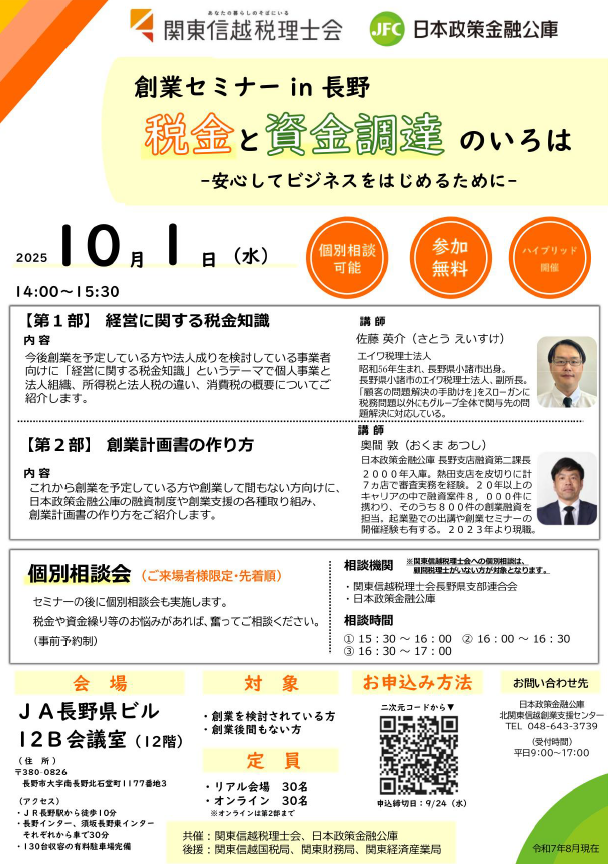 関東信越税理士会、日本政策金融公庫共催の創業セミナーです。