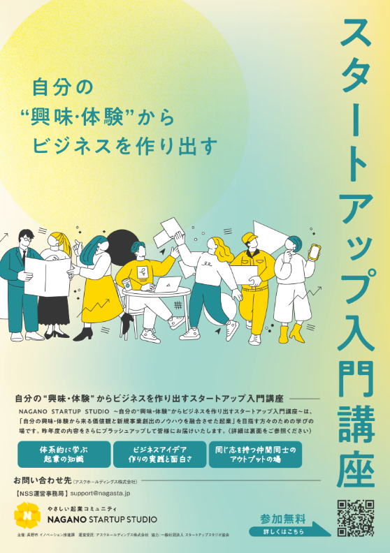 NAGANO STARTUP STUDIO 〜自分の ”興味・体験” からビジネスを作り出すスタートアップ入門講座〜は、「自分の興味・体験から来る価値観と新規事業創出のノウハウを融合させた起業」を目指す方々のための学びの場です。昨年度の内容をさらにブラッシュアップして皆様にお届けいたします。
