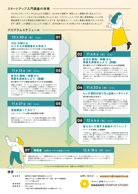 長野市が主催の長野市でのスタートアップ型の起業を支援するプログラムです。アイデア作り、メンバー募集、ビジネスモデル構築など、起業準備に必要なプロセスを体験できる内容となっています。