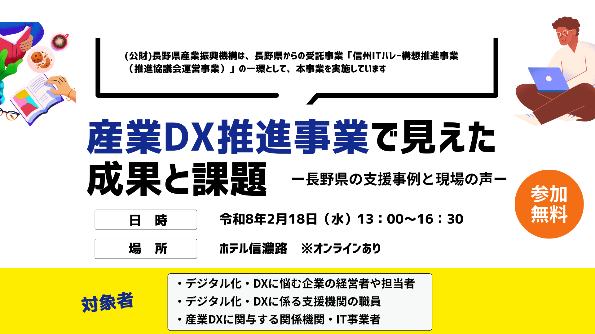 長野県産業振興機構は、 「信州ITバレー構想」のもと、県内産業の競争力強化に向けた取組の一つとして、産業DX推進に取り組み、県内企業のデジタル化・DXを支援してきました。 本イベントは、これまでの成果や課題を共有するとともに、支援を受けた企業の取組や意思決定、進め方を発表していただき、パネルディスカッションを行います。支援事例をもとに、企業・支援機関・IT事業者それぞれの立場で、今後の取組や支援のヒントを持ち帰っていただきたいと思います。